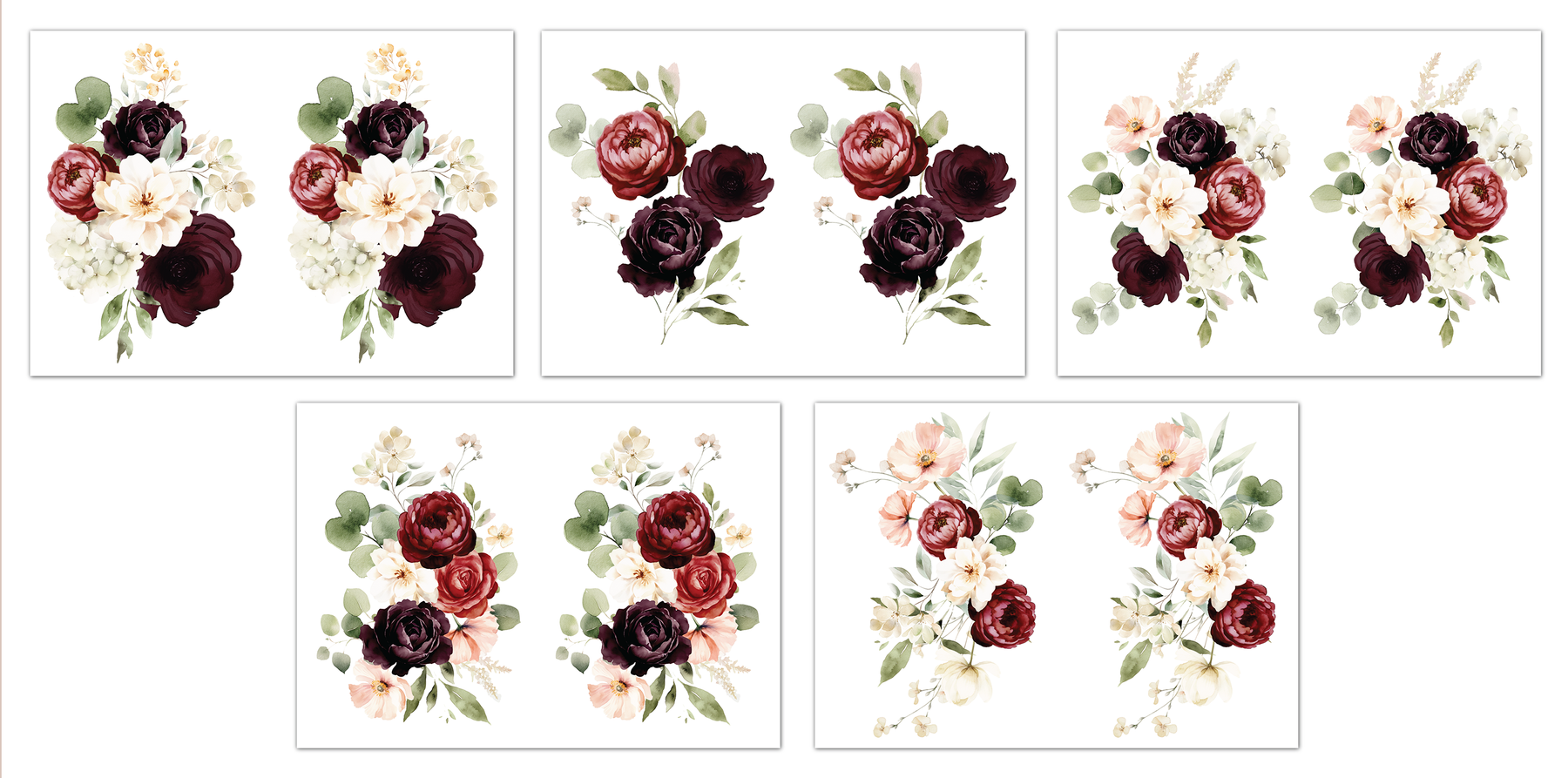 Bring instant, stunning floral beauty to your projects with the AquaInk Transfer Sheets – Valentina. This set features five vibrant floral bouquets with rich roses in deep red, burgundy, and purple, accented with touches of ivory and pale pink. Simply transfer the images face down onto watercolor paper and wet the back with a bit of water for a bold, painterly effect. Use them as striking focal points on their own, or pair with one of our Eclipse Dies for a peek-through, layered design that elevates your cards and creative projects.